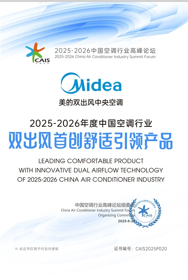 在技术创新上,美的中央空调持续将研发成果转化为产品实力。其超低频稳态技术斩获2025-2026中国空调行业高峰论坛“超低频技术创新金奖”,并通过“国际领先技术”鉴定,压缩机超低频稳态运行的能力获得权威认证。该项技术的代表产品美的领航者4代,则获第十五届中国家电营销年会磐石奖“突破创新奖”。